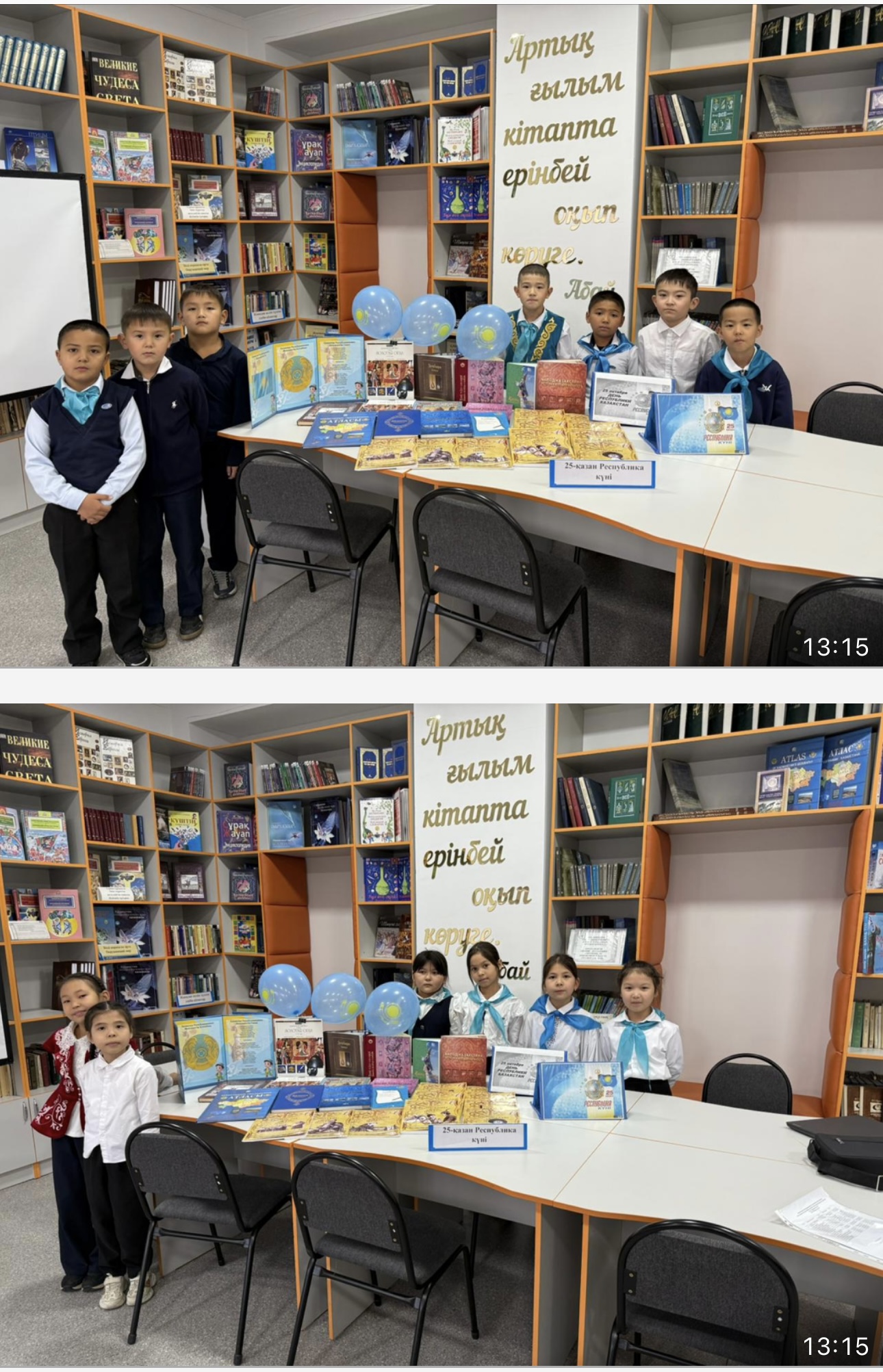"Балалар кітапханасы" республикалық жобасы аясында оқушыларды елін, жерін, тілін, тарихын құрметтеуге және де сүйіспеншілігін ояту мақсатында 25 қазан - Республика күніне орай "Тұғыры биік Қазақстан" атты кітап көрмесі ұйымдастырылды.Көрменің мақсаты: Тәуелсіз Қазақстанымыздың жетістіктері мен экономикалық дамуы, рухани өміріндегі оң өзгерістерді насихаттау.