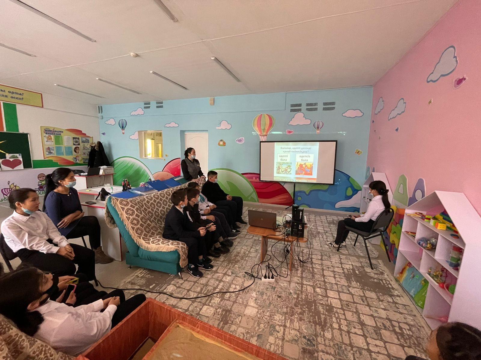 Мектеп психологы Д. Д. Дүйсембекова басқаруымен 5 сынып оқушыларына арналған тәрбиелік мәні бар «Әдептті бала» атты бейнесабақ