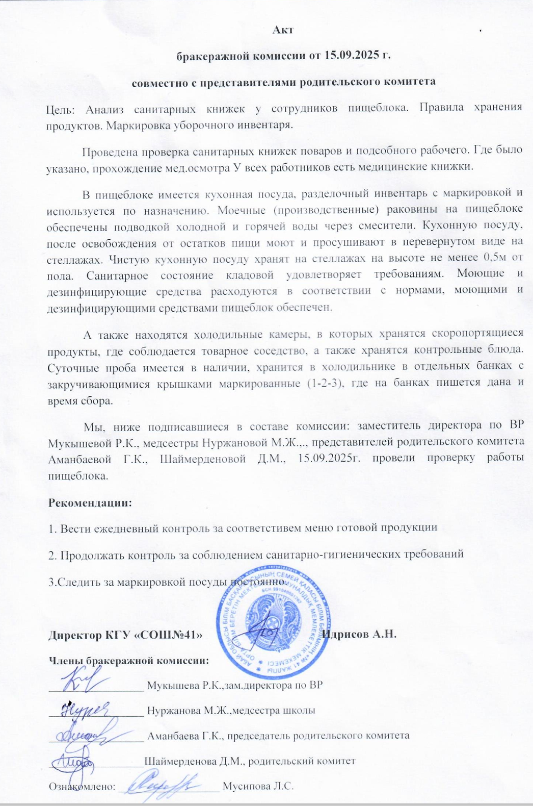 Акт бракеражной комиссии от 15.09.2025 г. » Средняя общеобразовательная школа № 41